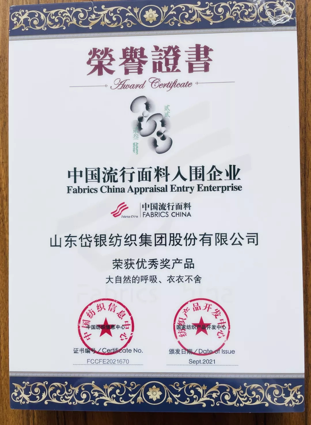 近日, 在由中國紡織工業(yè)聯(lián)合會主辦的2021中國國際面料設計大賽、第46屆(2022/2023秋冬)中國流行面料入圍評審活動中,岱銀集團紡織研究院參評的面料“大自然的呼吸”和“衣衣不舍”榮獲中國流行面料優(yōu)秀獎。