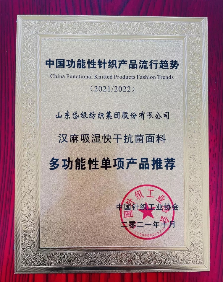 近日,由中國針織工業(yè)協(xié)會和中國國際貿(mào)易促進(jìn)委員會紡織行業(yè)分會舉辦的中國功能性針織產(chǎn)品流行趨勢發(fā)布活動于國家會展中心(上海)圓滿落下帷幕。岱銀紡織服裝研究院參評的“漢麻吸濕快干抗菌面料”獲得中國功能性針織產(chǎn)品流行趨勢多功能性單項產(chǎn)品推薦。